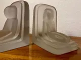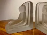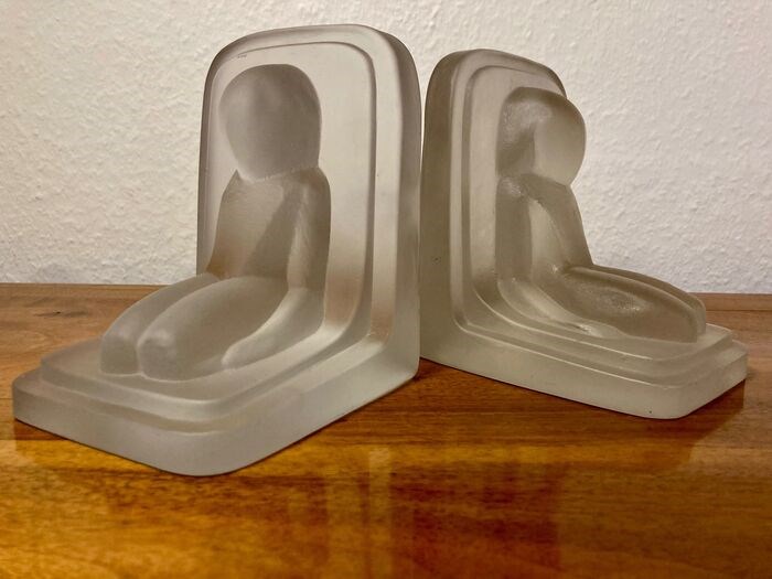 Twee (2) boekensteunen KO 1262 in gesatineerd persglas, in 1934 ontworpen door Lucienne Bloch (1905-1999) en uitgevoerd door de Glasfabriek Leerdam. Deze hebben geen meegeperst merkteken, wat erop duidt dat ze uitgevoerd zijn nadat Lucienne Bloch haar activiteiten voor Leerdam beëindigd had, dus hoogstwaarschijnlijk in de tweede helft van de jaren '30. Net als haar andere glasontwerpen onderscheiden deze zittende meisjes zich door hun eenvoudige, gestileerde en toch sprekende vorm. Zoals gebruikelijk bij persglas uit Leerdam zijn er enkele luchtinsluitingen. Verder verkeren ze in een bijzonder fraaie staat.