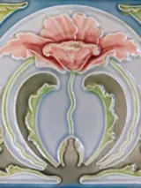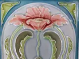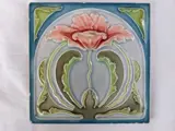 Art Nouveau tegel (14,6 x 14,6 cm) met daarop een bloem gemaakt bij M.O.&.P.F. in Duitsland.