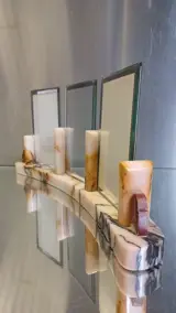 Met twee glazen per foto voor elke ondersteuning, de foto gaat tussen de 2 glas plaatjes en die staat dan weer op de marmeren sokkel.