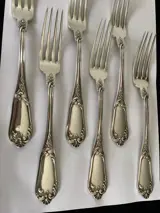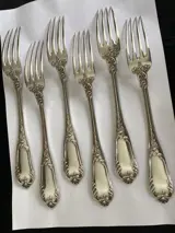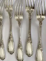 Zes exclusieve Antieke massief zilveren Art Nouveau vorken met elegante florale rocaille versieringen in hoogreliëf.