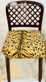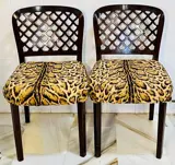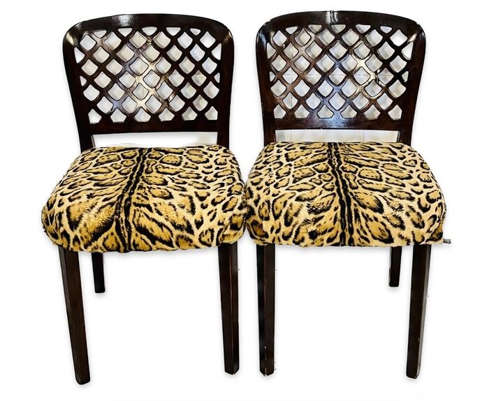Antieke Max Bill design stoelen vervaardigd in genummerde series door Horgen Glarus in Zwitserland uit de eerste helft van de 20e eeuw. Het zijn twee zeer goed bewaard gebleven mahoniehouten stoelen met traliewerk op de rugleuning en moderne bekleding in gecapitonneerde viltstof in de vorm van luipaardvel. Behorend tot een privécollectie, unieke stoelen op de markt en exclusief design.