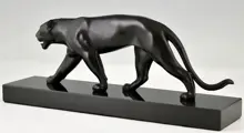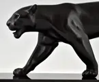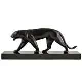 De panter is uitgevoerd in metaal met zwarte patina en staat op een zwart marmeren sokkel.