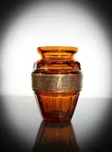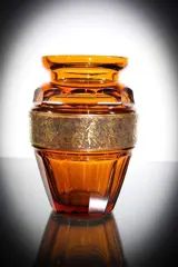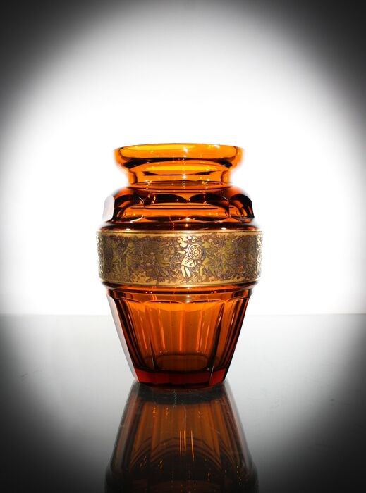 Prachtig kristallen vaas die facet is geslepen en voorzien in het midden van een vergulde band met romeinse taferelen .