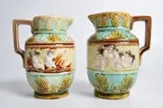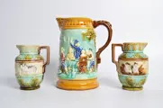 Verzameling van drie majolica kruiken/kannen van de Belgische maker Mouzin Lecat & Cie, vervaardigd eind 19e eeuw. Allemaal levendig en kleurrijk gedecoreerde keramische stukken met prachtige afbeeldingen van volkse taferelen.