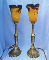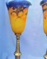 Een zeldzaam paar (2 stuks!) koperen lampen met veelkleurige Muller Tulipe. Nieuwe netsnoeren en schakelaars!