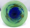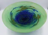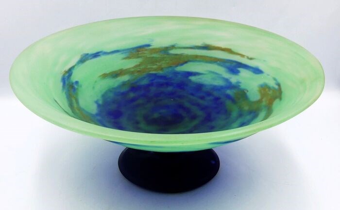 Fruitschaal op sokkel, in meerlaags glas met een blauwe, groene en bruine marmoreal achtergrond.