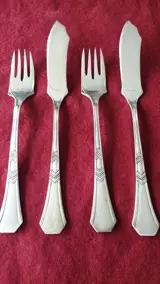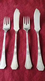 Aangeboden wordt een zeer decoratief mooi gedecoreerd 24-delig verzilverd (20 legering) visbestek uit de overgangsperiode Art Nouveau/Art Deco periode uit de fabriek Noveda omstreeks 1920.