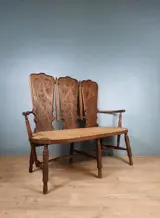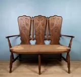 Bestaande uit mulch zittingen met afgeronde vormen, bekroond door gevormde geschulpte rugleuningen met corbin snavels en gebeeldhouwd met bloemendecoraties, het geheel rust op gedraaide houten poten verbonden door H-vormige afstandhouders