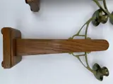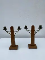 Een zeer mooi paar art deco beïnvloede kandelaars in Amsterdamse School Stijl. Gemaakt van eikenhout met messing beslag. Met de hand gesneden en gedecoreerd en in goede staat met ouderdomssporen zichtbaar in de patina. Nog steeds bruikbaar en decoratief. Het messing is in goede staat. Ze meten 28cm H op een basis van 10x7cm.