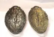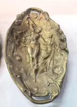 Paar dienbladen in brons met afbeelding van een naakte vrouw, een glanzende en een ondoorzichtige, geproduceerd in Italië in 1900