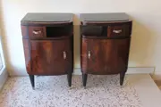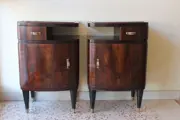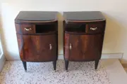 De nachtkastjes hebben een zwart opaline blad in een houten onderstel dat gebogen is in de hoeken