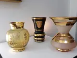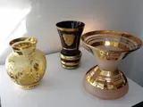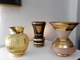 Drie gave Art Deco Vazen van Rupel Boom, Belgie 30/40er jaren, ontwerp Paul Heller, 1x model Vera, kleur peach/goud, hoogte 20cm, doorsnede 17cm, 1x model Irene, zwart opaline met goud motief, hoogte 19cm en 1x zeldzaam model Aline in geel/goud motief, hoogte 17cm, mooie gave set.