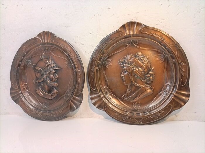 Ik moet u een origineel object aanbieden uit het Secession-tijdperk, dat afkomstig is uit een particuliere familiecollectie. Een paar van 2 stuks. portret van een dame, portret van een ridder. Grote plaquettes, reliëf, bas-reliëf. Gemaakt van brons. Ze komen uit het Art Nouveau tijdperk, Frankrijk. Heel goede staat . Afmeting diameter 26,5 cm Verouderd uniek origineel uit de periode 1890-1919. Franse afscheiding.