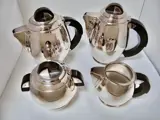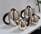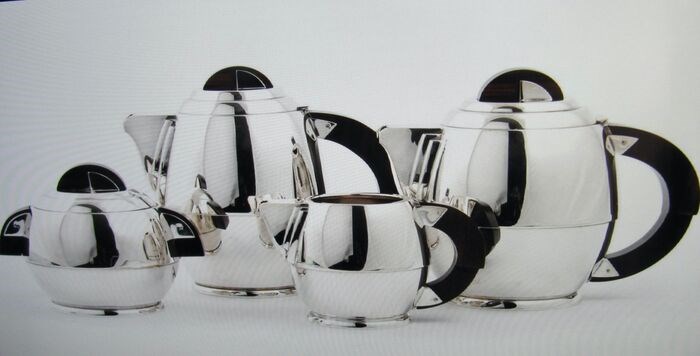 Het verzilverde theeservies met palissander grepen en garnituren komt vermoedelijk uit de Art Deco periode in de jaren '30.