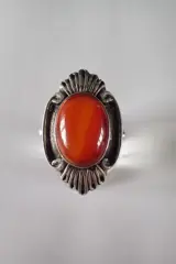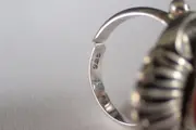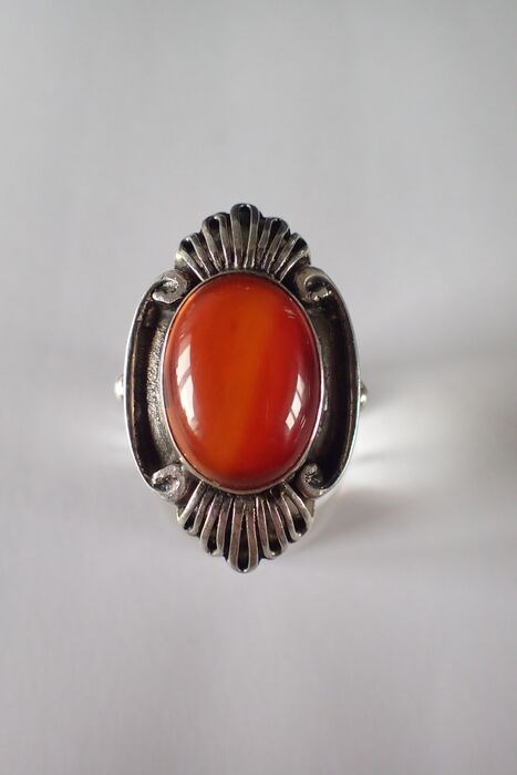 Prachtige grote Art Deco ring met een decor van lussen, gezwarte zijkanten, bolletje aan zijkant en een grote cabochon van Agaat.