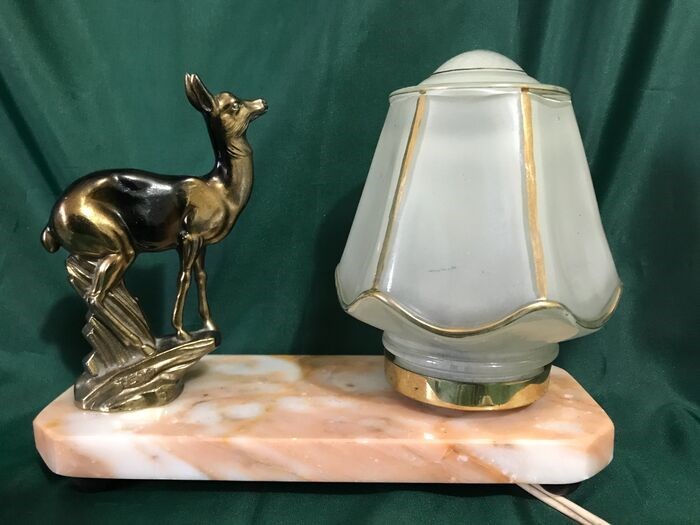 zeer mooie zeem of hinde met een lamp in een zeer originele vorm, alles op een roze marmer, geen barsten, geen breuken, geen gebreken
