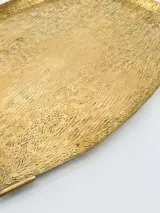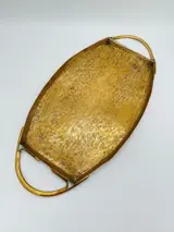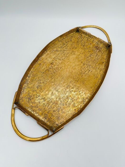 Een zeer mooi messing secessionistisch dienblad met houtnerfstructuur en gebogen handgrepen