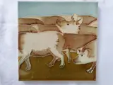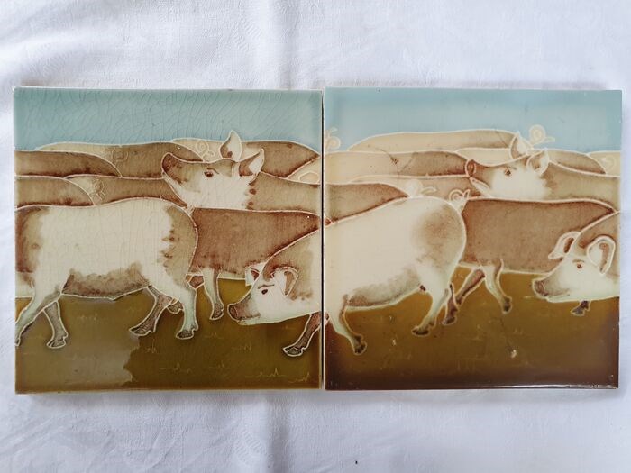 Twee zeer zeldzame Jugendstil / Art Nouveau tegels met daarop varkens geproduceerd door Servais Werke A.G. Ehrang in Duitsland.