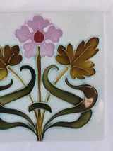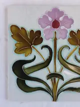 Twee Art Nouveau tegels met daarop kleurijke bloemen gemaakt door Societé Ceramique Morialmé in België.