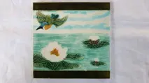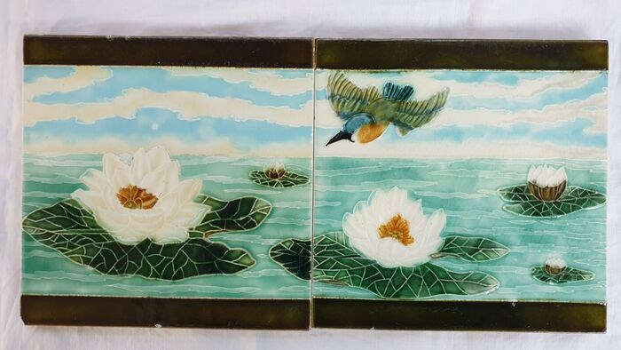 Twee Art Nouveau tegels met daarop waterlelies en een ijsvogel gemaakt door Societé Ceramique Morialmé in België.