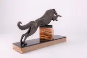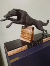 Geweldig Art Deco beeld van een windhond, in grijze patina, op een marmeren voet (zwart, bruin, geel en wit voet). Volgens specialisten is dit beeld afkomstig uit Frankrijk. De borst van de windhond steunt ook op een kleine muur van marmer.