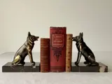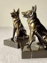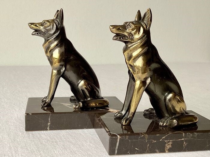 Beiden gemaakt van bronskleurig gepatineerd zamac en staan vast op mooie marmeren voetstukken.