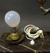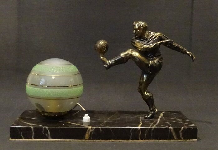 Een art deco tafellampje met een voorstelling van een voetballer. Het art deco lampenkapje heeft een scheur, zie foto, en de stekker is aan vervanging toe. Originele fitting met bajonet sluiting. Breedte van het lampjeis 30 cm en het staat op een marmeren voet, deze heeft lichte gebruikssporen.