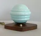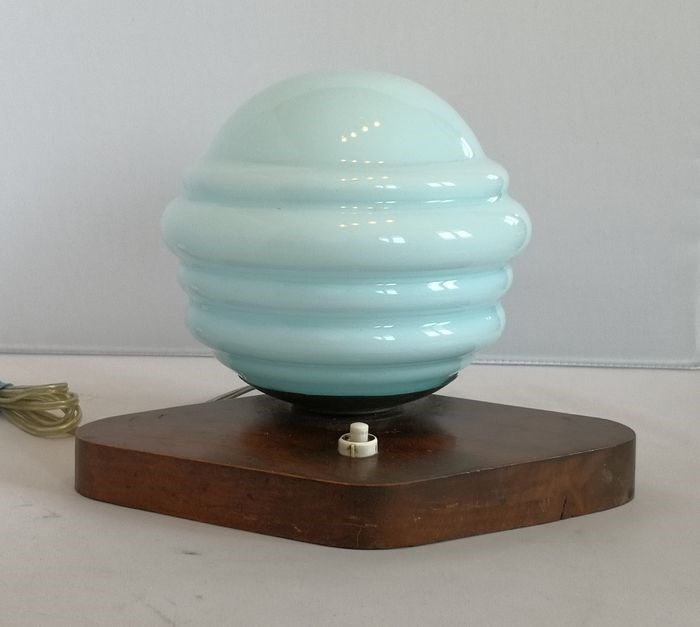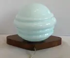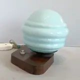 Originele Art-Decò lamp met een bijzondere houten voet in de vorm van een schild en een mooie originele lampenkap in lichtblauw bol glas.