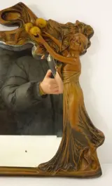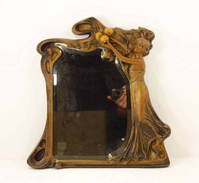 Grote tafelspiegel in gepatineerd bronzen spelter en afgeschuinde spiegel versierd met een vrouw die een fruit vangt, art nouveau periode 1900.
