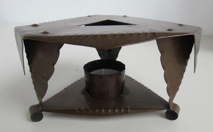 Schitterend vormgegeven driehoekig theelichtje uit de Art-Deco periode, met alle kenmerken van de Amsterdamse School.