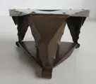Het bovenblad, met omgeslagen punten en licht gebogen zijkanten met van achter ingeslagen bobbeltjes op de vouwhoek, vertoont het bekende hamerslag-effect. De pootjes, met golvende randen en ook weer bobbeltjes op de vouwhoek , zijn aan de onderzijde samen met de hoeken van het onderblad opgerold; een zeer verrassende verbinding. In het onderblad, ook weer met licht gebogen zijkanten met bobbeltjes, zijn driehoekige lipjes naar boven gebogen, zodat het originele waxinelichthoudertje met golvende bovenrand stevig staat.