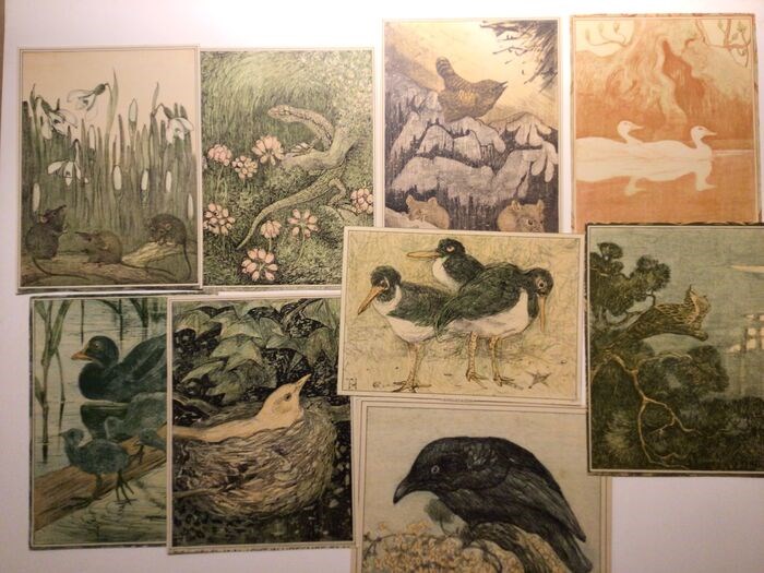 Mooi lot van 9 originele gelithografeerde illustraties uit de kalenders van Theo van Hoytema. Hij publiceerde deze kalenders tussen 1902 en 1917. De jaartallen en enkele titels zijn met de hand op de achterkant geschreven. Conditie is over het algemeen zeer goed, enkele kleine gebruikssporen. Grootte varieert een beetje.