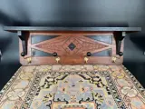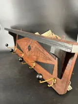 Unieke amsterdamse school kapstok met vier karakteristieke haken en een authentiek muurkleed eraan.