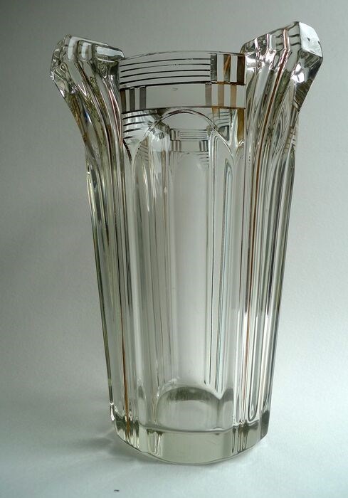 Prachtige Art Deco vaas in helder glas van Josef Inward uit Tsjechië met gouden decoratie.
