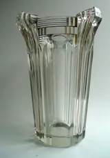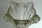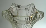 Nr: 11701 in een catalogus uit de jaren 40. Art Deco vormgeving en geometrisch model. In zeer goede staat maar heeft krassen aan de onderkant van de sokkel aan de buitenkant. Geperst glas kan kleine luchtbelletjes of oneffenheden bevatten.