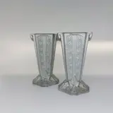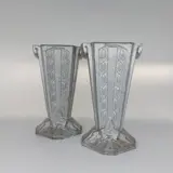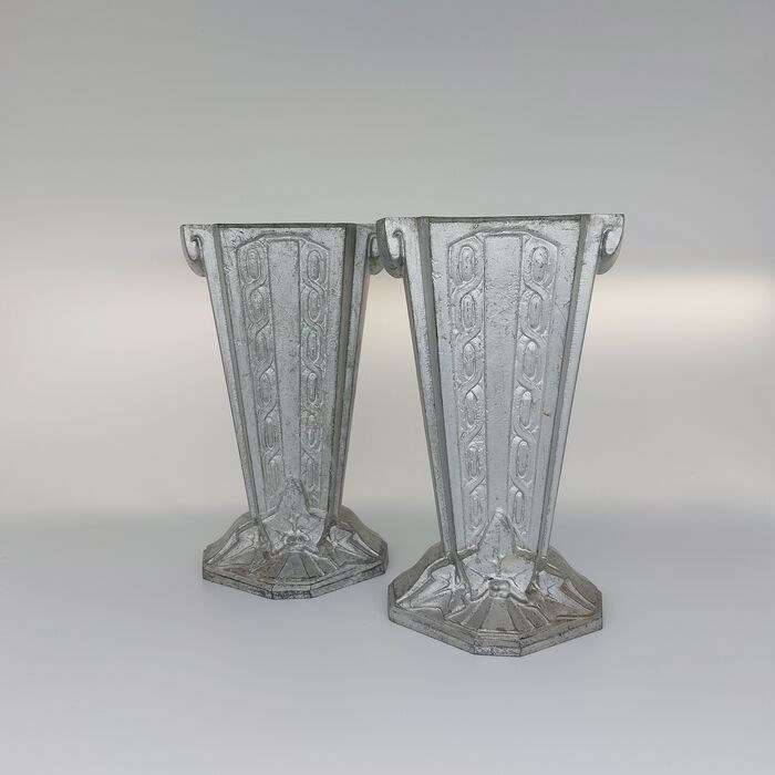 Leuke set art deco vaasjes van gegoten aluminium. De vaasjes hebben een signatuur, maar mij is niet duidelijk wie de maker is. Vermoedelijk geproduceerd begin van de 20e eeuw in Frankrijk.