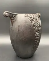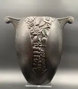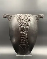 Zeldzame zware gietijzeren Art Deco vaas. Maker bij mij onbekend en op Internet slechts één identieke vaas te vinden. Hoogte ongeveer 26,5 cm, maximale breedte 28 cm. en doorsnede van de buik ongeveer 21 cm.