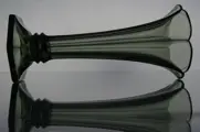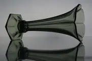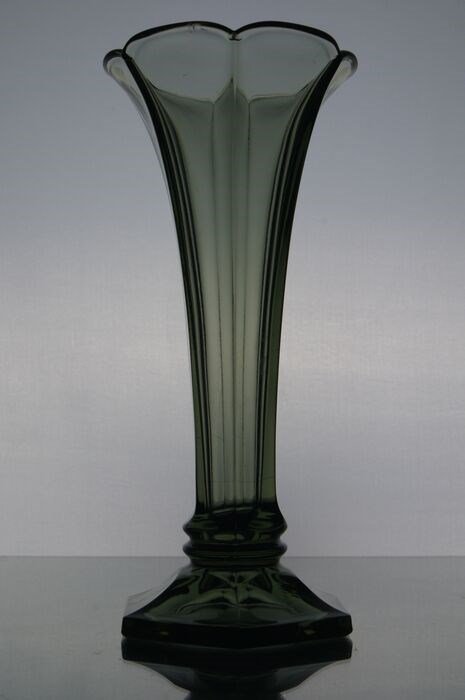 Art deco vaas, model ‘Americain’,uit de Luxval collectie van de Belgische glas- en kristalfabriek Val Saint Lambert uit België. Ontwerp van Charles Graffart en Rene Delvenne. Deze dit model is uitgevoerd in olijfgroen transparant persglas.