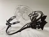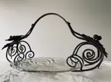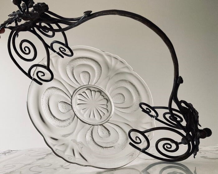 Schaal / bord in helder persglas van de Verreries & flaconneries / bouteilleries de Beignée (Ham-sur-Heure) Pavillons / Pavilux (1922-1957), ongemerkt maar geattesteerd in een cataloog van de manufactuur uit de jaren '30 (met de typische onregelmatigheden bij persglas, zoals belletjes), gevat in een elegante smeedijzeren handgreep gedecoreerd met bessen en bladeren, die ongemerkt is maar doet denken aan de stijl van Lode Van Boeckel (1857-1944). Het samengestelde stuk weegt totaal 2070 gr., is 48 cm breed en 26,5 cm hoog, met een doorsnee van de schaal zelf van 30 cm.