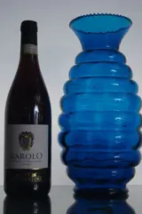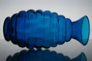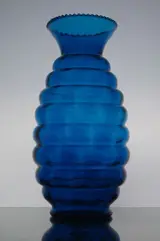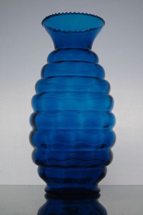 De vaas is uitgevoerd in een uitzonderlijke blauwe kleur (blue pètrole), is optisch geblazen en heeft een gekartelde rand. De vorm is typisch is voor de Floralies productie en staat afgebeeld op plaat 126 van de Doyen catalogus uit het interbellum. Dit exemplaar meet ca 30 cm hoog.