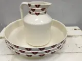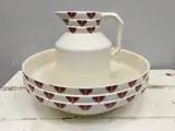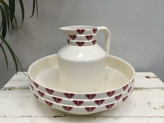 Fraaie Art Nouveau lampetset / lampetstel uit 1902, ontworpen door Josef Olbrich voor Villeroy & Boch. De set verkeert in gebruikte, antieke staat. De waskom heeft schade aan de rand (vijf schilfers), de kan heeft een haarlijntje en er ontbreekt aan de onderzijde een stukje glazuur, evenals aan de binnenkant.
