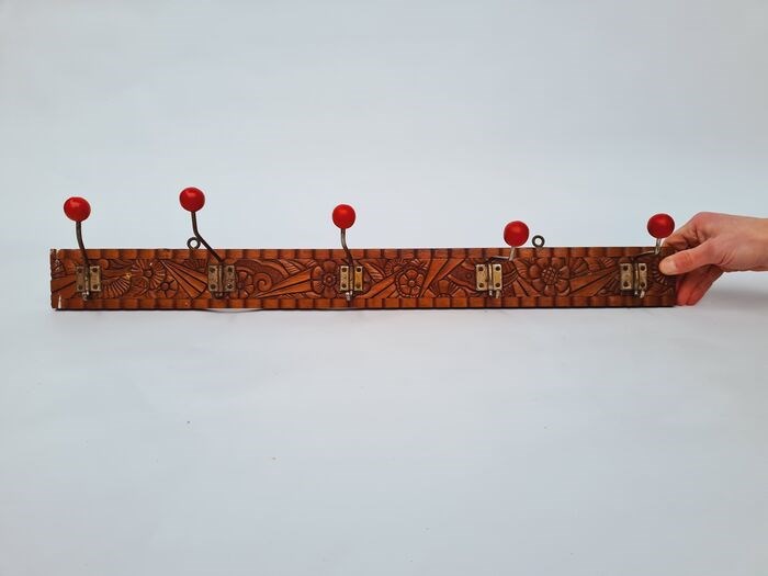 Dit is een aanbieding van van een Art-Nouveau wand kapstok uit hout met ijzeren haken afgewerkt met houten knoppen. Sommige haken zijn momenteel beweegbaar.