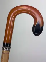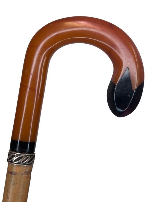 Een Art Deco wandelstok, amberkleurig met zwarte haakgreep, gemaakt uit Celluloid.