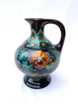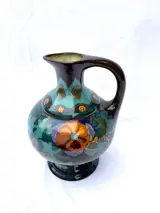 Deze fraaie vaas is gemaakt bij plateelbakkerij Arnhem. De hoogte is 22 en de diameter is 15 cm. Hij is gedecoreerd met een handgeschilderd decor Polo. De ontwerper van dit decor is Willem Hartgring die eerder bij plateelbakkerij Zuid Holland werkte. Dit decor Polo is de Arnhemse versie van decor Corona van plateelbakkerij Zuid Holland. Dit item is in een uitstekende staat zonder chips, scheuren of reparaties.