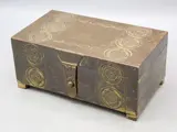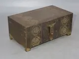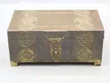 Een fijne Art Deco koperen doos op vier poten, gedecoreerd in laag reliëf met geometrische cirkelfiguren en aan de binnenkant bekleed met cederhout.