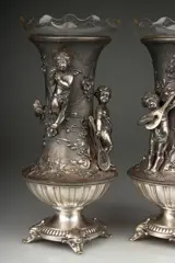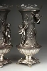 Een paar Art Nouveau vazen - WMF. Oud, origineel, geslepen en gegraveerd glas. Herkomst: Duitsland, begin 20e eeuw Zeer goede staat, zichtbaar wit sediment binnenin het glas, slijtage van de verzilvering en gebruikssporen.