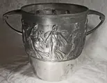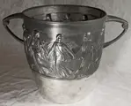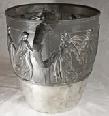 Verzilverde Art Nouveau WMF wijnkoeler met dansende vrouwen. Onder andere voorzien van het WMF bedrijfslogo.
