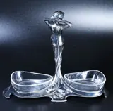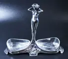 Originele WMF Art Nouveau zoutkomhouder met een afbeelding van een vrouw. Gestempeld met het WMF-logo. Krassen en zilver slijtage zie foto's. Glazen schaal aan de onderkant bekrast maar zonder chips.
