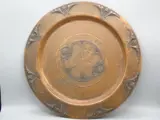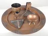Een geslagen koperen en gegoten messing rookset, bestaande uit een luciferdoosje, een kandelaar, een sigarettenhouder en een asbak, gepresenteerd op een rond blad met een diameter van 35,3 cm.
