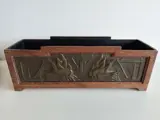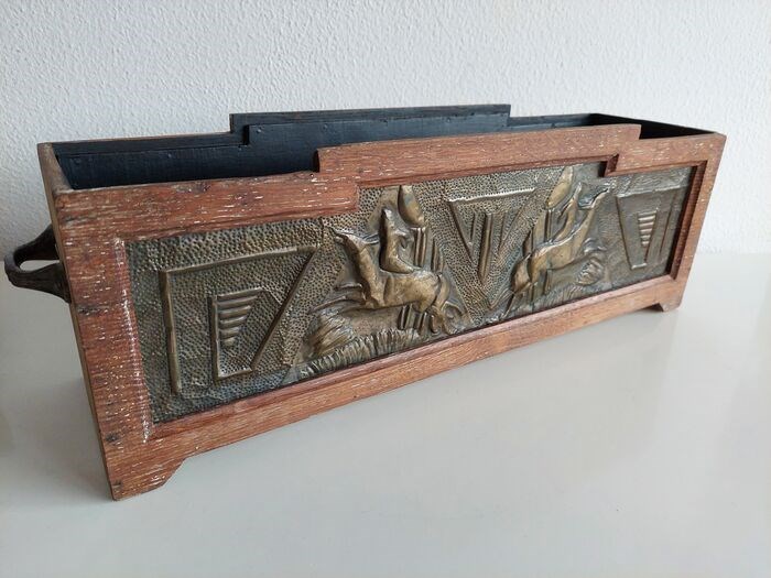 Deze bak is aan voor en achterzijde voorzien van een prachtig in dun messing uitgedreven motief, met geometrische lijnen en geabstraheerde herten.